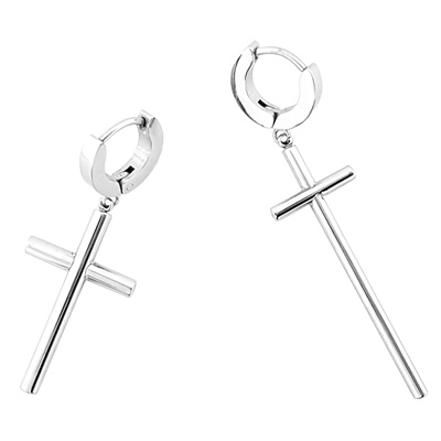 원터치 피어싱에 슬림 롱 체인과 스틱 십자가가 장식된 피어싱으로